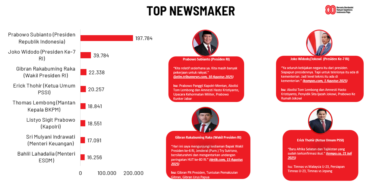 Dari sisi tokoh, Presiden Prabowo Subianto menjadi tokoh yang paling banyak dikutip media yakni 197.784 statement. Pernyataan Presiden Prabowo terkait empat isu utama—pertemuan dengan Kapolri dan Mentan, kebijakan abolisi dan amnesti, upacara kehormatan militer, serta kunjungan ke Jawa Barat—mendominasi publikasi.