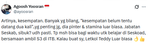 Di sisi lain, terdapat juga warganet yang memberikan respons positif terhadap langkah Teddy menempuh S3 di ITB dan mengikuti Seskoad. Warganet menilai Teddy sebagai sosok pejabat yang tetap mau belajar meski sudah berada di posisi yang tinggi. Unggahan tentang aktivitas kuliahnya juga dianggap menunjukkan sisi manusiawi seorang pejabat, karena terlihat tetap berusaha membagi waktu antara pekerjaan dan pendidikan. Sebagian warganet memuji semangat belajarnya dan menganggap hal ini bisa jadi contoh bahwa siapapun tetap bisa melanjutkan pendidikan meskipun sibuk dengan pekerjaan.