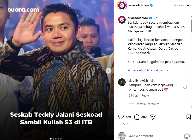 Beberapa hari terakhir, pemberitaan mengenai Sekretaris Kabinet, Letkol Inf Teddy Indra Wijaya, menjadi bahan perbincangan luas di media sosial. Berita tersebut mencuat setelah sejumlah unggahan mengabarkan bahwa selain menjalani tugas kenegaraan, Teddy juga mengikuti Pendidikan di Sekolah Staf dan Komando Angkatan Darat (Seskoad) dan menempuh studi S3 di Institut Teknologi Bandung (ITB).