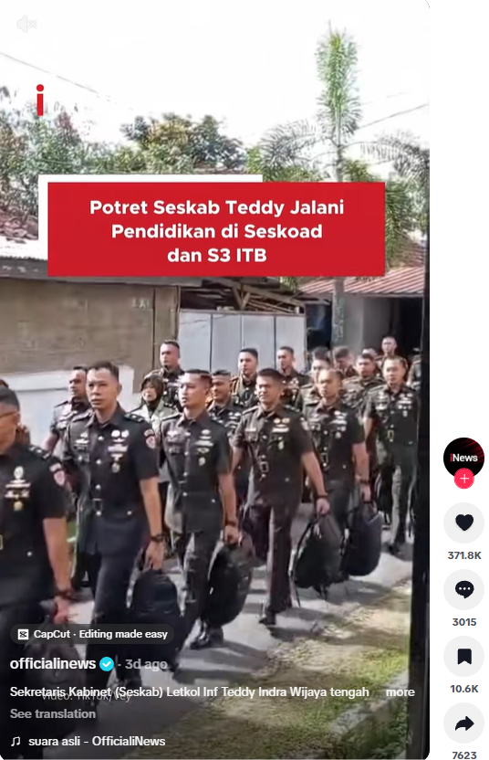 Salah satu unggahan yang paling banyak menarik perhatian berasal dari akun TikTok @officialinews yang menampilkan video Sekretaris Kabinet Teddy Indra Wijaya yang sedang menjalani Pendidikan di Seskoad dan S3 di ITB. Konten tersebut mendapatkan engagement tertinggi dengan total 381.997, terdiri dari 371.375 likes, dan 3.005 comment. Tingginya angka interaksi menunjukkan bahwa topik ini memiliki daya tarik besar di media sosial.