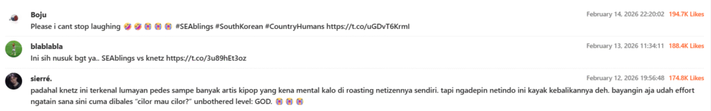 Berdasarkan data top likes, tiga akun yang paling banyak memperoleh apresiasi selama periode 11–17 Februari 2026 adalah @Boju3006, @vidvedvodvud, dan @akunrambat. Unggahan dari ketiga akun tersebut umumnya berupa satire dan penggunaan tagar #SEAblings.