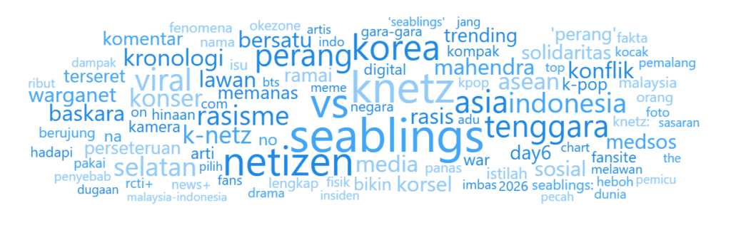 Analisis wordcloud menunjukkan kata kunci dominan seperti “rasisme”, “perang”, dan “konflik”. Hal ini sejalan dengan isu yang paling banyak diberitakan, yakni dugaan rasisme oleh netizen Korea Selatan serta ketegangan antara SEAblings dan Knetz. Secara umum, pemberitaan cenderung mengarah pada sentimen negatif.