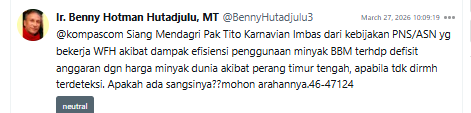 Selain itu, publik juga menyoroti aspek implementasi, mulai dari kesiapan infrastruktur kerja jarak jauh, mekanisme pengawasan ASN, hingga relevansi penerapannya di berbagai sektor. Hal ini menunjukkan bahwa kebijakan WFH tidak hanya dipandang dari sisi efisiensi energi, tetapi juga memiliki implikasi operasional dan ekonomi yang lebih luas.
