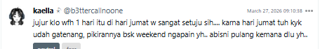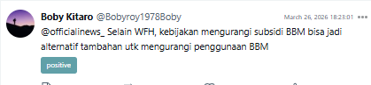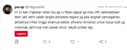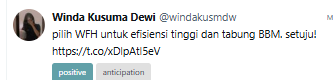 Meskipun begitu, tetap ada narasi positif terkait kebijakan WFH 1 hari yang bakal diterapkan oleh pemerintahan, yaitu netizen yakin bahwa konsumsi BBM akan turun dan efisiensi anggaran akan tetap didapatkan sesuai rencana. Selain itu, inovasi-inovasi kebijakan lain akan tetap dicoba untuk mengurangi ketergantungan Masyarakat ke BBM.