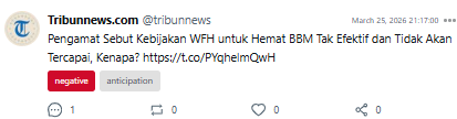 Sementara itu, Purbaya Yudhi Sadewa (Menteri Keuangan) menekankan potensi penghematan konsumsi BBM dari penerapan WFH. Narasi yang dibangun berfokus pada estimasi efisiensi energi, sehingga memperkuat framing bahwa kebijakan ini merupakan langkah taktis dalam menekan permintaan energi.