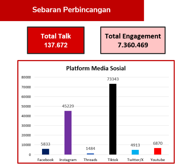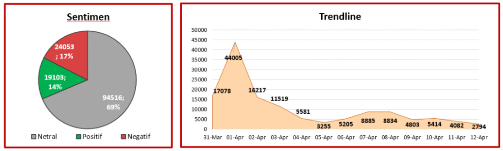 Dalam periode 31 Maret hingga 12 April 2026, dashboard social media listening Socindex, menjaring sebanyak 137.672 percakapan warganet di berbagai platform (X/Twitter, Facebook, Instagram, Youtube, dan Tiktok) dengan total engagement mencapai 7.360.469. Berdasarkan data yang sama, sentimen publik terhadap kebijakan ini didominasi oleh sikap netral, yaitu sebesar 69 persen, sementara sentimen negatif tercatat 17 persen dan positif 14 persen. Dari segi platform, mayoritas warganet membincangkan kebijakan ini di TikTok dan Instagram, dengan jenis percakapan yang paling banyak berupa komentar pada unggahan.