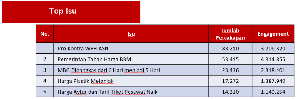 1) Pemerintah perlu memfokuskan komunikasi pada isu dengan volume percakapan tertinggi saat ini, yaitu WFH ASN, Ketersediaan dan Harga BBM (Subsidi dan Non-Subsidi), serta MBG juga kenaikan harga-harga yang muncul saat ini seperti harga plastik dan juga harga avtur yang mengakibatkan kenaikan harga tiket pesawat.