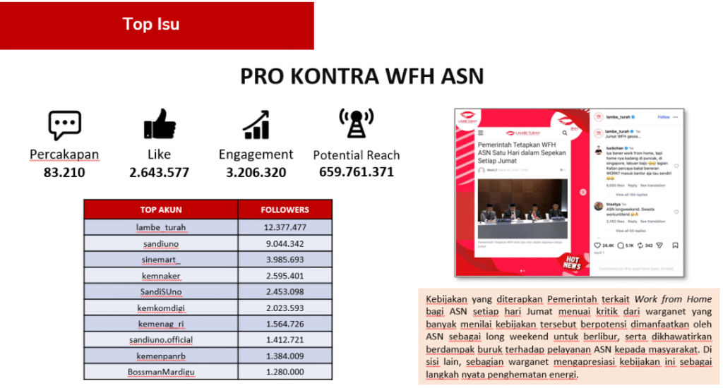 “Isu WFH ASN mencuri perhatian terbesar. Kebijakan yang ditujukan untuk menghemat energi dengan mengurangi mobilitas dan konsumsi bahan bakar di perkantoran ini menuai pro dan kontra yang tajam. Warganet yang kontra mengkritik bahwa kebijakan tersebut berpotensi dimanfaatkan oleh ASN sebagai long weekend untuk berlibur, bukan untuk bekerja secara produktif dari rumah. Kekhawatiran yang lebih mendasar adalah turunnya kualitas pelayanan publik, mengingat banyak masyarakat yang masih memerlukan layanan administratif dan teknis pada hari Jumat,” ujar Danu.