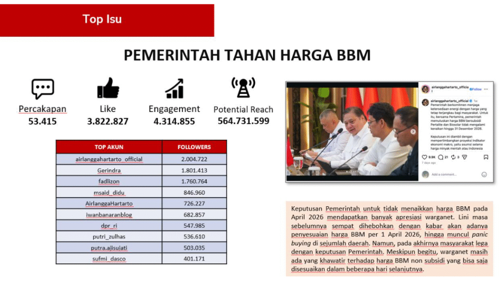 Berbeda dengan isu WFH yang kontroversial, keputusan pemerintah untuk tidak menaikkan harga BBM pada April 2026 mendapatkan apresiasi luas. Manajer News Data Analytics Binokular (Newstensity) Nicko Mardiansyah menyebut, sebelum pengumuman, media sosial sempat dihebohkan oleh kabar bahwa akan ada penyesuaian harga BBM per 1 April.