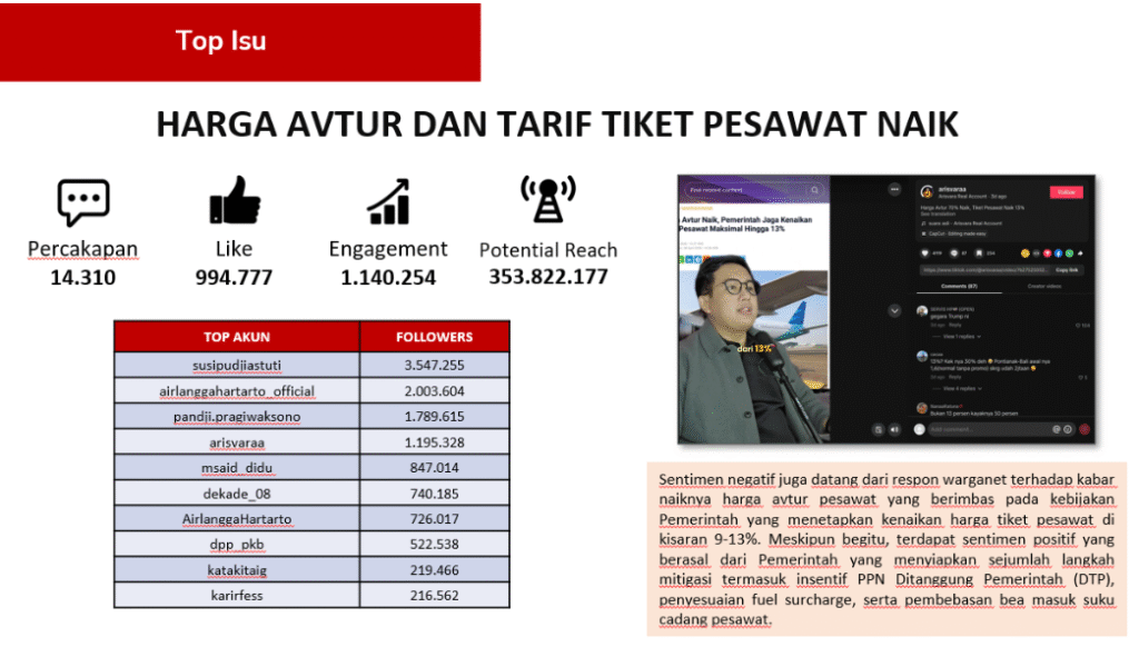 Sementara itu, kenaikan harga avtur memaksa pemerintah menyesuaikan tarif tiket pesawat di kisaran 9 hingga 13 persen. Sentimen negatif pun bermunculan, terutama dari warganet yang sering menggunakan transportasi udara. Namun, pemerintah tidak tinggal diam. Berbagai langkah mitigasi disiapkan, antara lain insentif PPN Ditanggung Pemerintah (DTP), penyesuaian fuel surcharge, serta pembebasan bea masuk suku cadang pesawat. Langkah-langkah ini berhasil meredam sebagian sentimen negatif dan bahkan memunculkan apresiasi dari warganet yang memahami upaya pemerintah menjaga stabilitas sektor penerbangan.