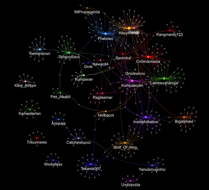 Vice President Operation Binokular Big Data Analytics Ridho Marpaung menyebut bahwa hasil Social Network Analysis (SNA) menampilkan pola percakapan yang terfragmentasi ke dalam beberapa klaster besar tanpa adanya satu aktor yang benar-benar dominan. “Klaster utama terbentuk di sekitar akun-akun seperti @Prabowo, @Hasyimmah, @pandji, @Gerindra, dan sejumlah akun arus media berita. Struktur ini menunjukkan bahwa publik menerima informasi dari berbagai sumber dengan framing yang berbeda, lalu memperluas jangkauan percakapan ke klaster lain,” kata Ridho.
