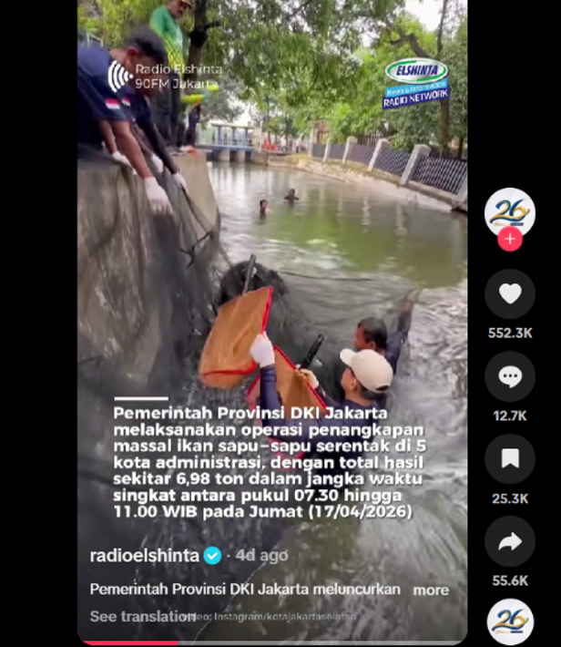 Salah satu unggahan yang diperoleh dari media sosial dengan respons audiens tertinggi terkait isu ini berasal dari akun TikTok @radioelshinta, menampilkan operasi pengendalian ikan sapu-sapu dengan penangkapan massal serentak di lima kota administrasi Jakarta dengan hasil total 6,98 ton pada hari Jumat, 17 April 2026. Ikan sapu-sapu hasil tangkapan mengandung residu logam berat tinggi sehingga dipastikan tidak dikonsumsi dan dilanjutkan dengan penguburan terkontrol.
