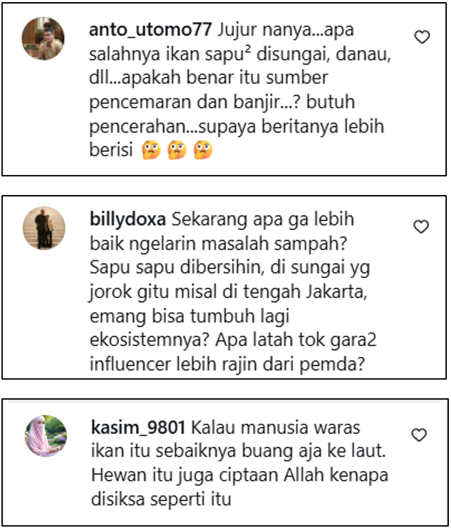 Di sisi lain, sebagian warganet menunjukkan reaksi negatif terhadap isu ini berupa kritik dan mempertanyakan efektivitas pemusnahan ikan sapu-sapu bagi lingkungan dan dalam jangka panjang. Seperti komentar yang mempertanyakan mengapa langsung dilakukan pemusnahan tanpa memanfaatkan terlebih dahulu, atau mengomentari pemerintah seharusnya memerhatikan isu lain yang lebih krusial dan menilai upaya ini tidaklah mendesak.