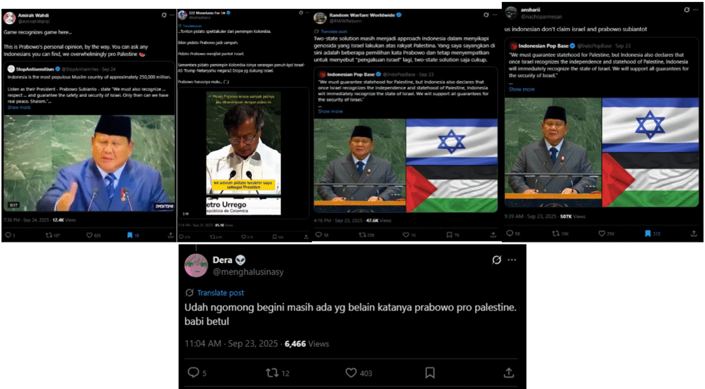 Prabowo’s statements also caught the attention of Israeli media. The Jerusalem Post reported on his readiness to send 20,000 peacekeepers to Gaza and his emphasis on respecting Israel’s right to security. The Times of Israel similarly highlighted his pledge to ensure Israel’s security and noted that Indonesia currently has no diplomatic ties with Israel. American‑based anti‑antisemitism account @StopAntisemites shared a clip of Prabowo’s speech, praising his willingness to recognise Israel, inadvertently creating the impression that his remarks legitimized Israel and Zionism.