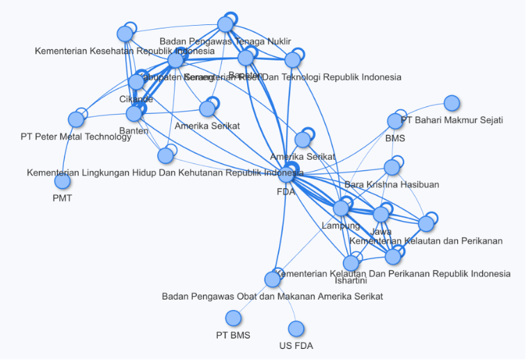 Network analysis revealed a tightly linked triad of key institutions: the FDA, KLHK, and BAPETEN.