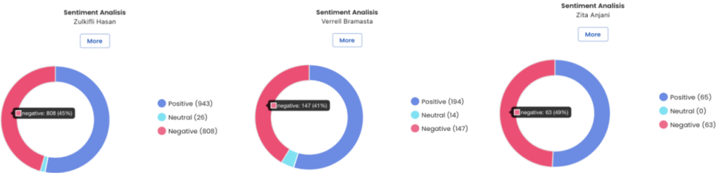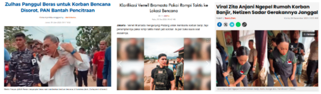 This can be seen in the media coverage of these figures in relation to the Sumatra floods. Using tools from Newstensity, a comparison of media coverage on the floods and these three political figures shows that almost half of the news coverage was negative. The surge of negative sentiment in national media reflects the dissatisfaction of netizens on social media. Symbolic gestures and political performativity, instead of drawing public sympathy, further deepened the emotional distance between the leaders and the people. Ironically, this same concern was also echoed by President Prabowo, who criticized political figures who were busy taking photos at the disaster site.