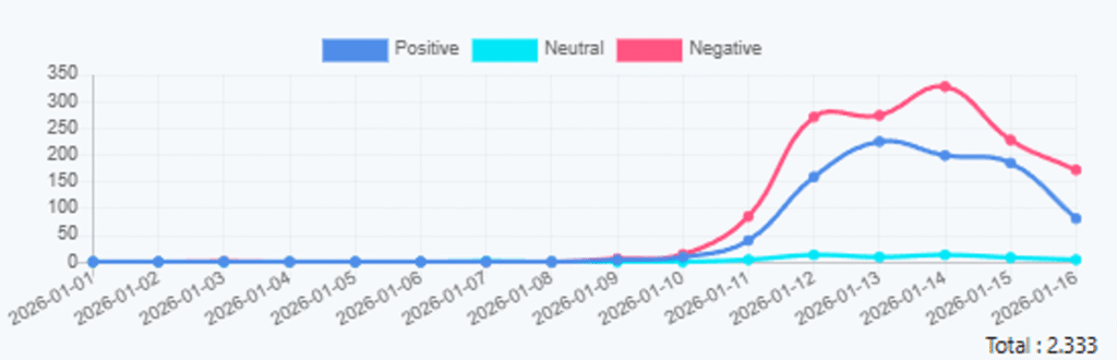 Newstensity recorded that during 1–16 January 2026, there were 2,333 articles discussing “Broken Strings” and Aurelie Moeremans. Coverage with a negative tone dominated the public space through heartbreaking narratives about Aurelie’s past. The main focus in this category was harsh condemnation of the perpetrator, as well as reports on alleged threats targeting Aurelie and public figures supporting the survivor. In contrast, positive-toned coverage emerged as moral resistance in the form of an extraordinary wave of support for Aurelie. Many media outlets highlighted appreciation for her courage in breaking the silence, while also opening space for more educational discussion about trauma recovery and mental health.