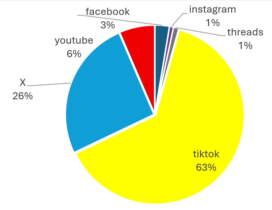 Socindex data show the volume of discussion was heavily dominated by two social platforms. TikTok was the most dominant platform, accounting for 63% of total discussion volume, followed by X contributing 26%. Other platforms such as YouTube (6%), Facebook (3%), Instagram (1%), and Threads (1%) contributed only marginally. This concentration highlights a shift in the social-media landscape, where short-form video platforms have become the primary force in shaping public opinion and attention in Indonesia.
