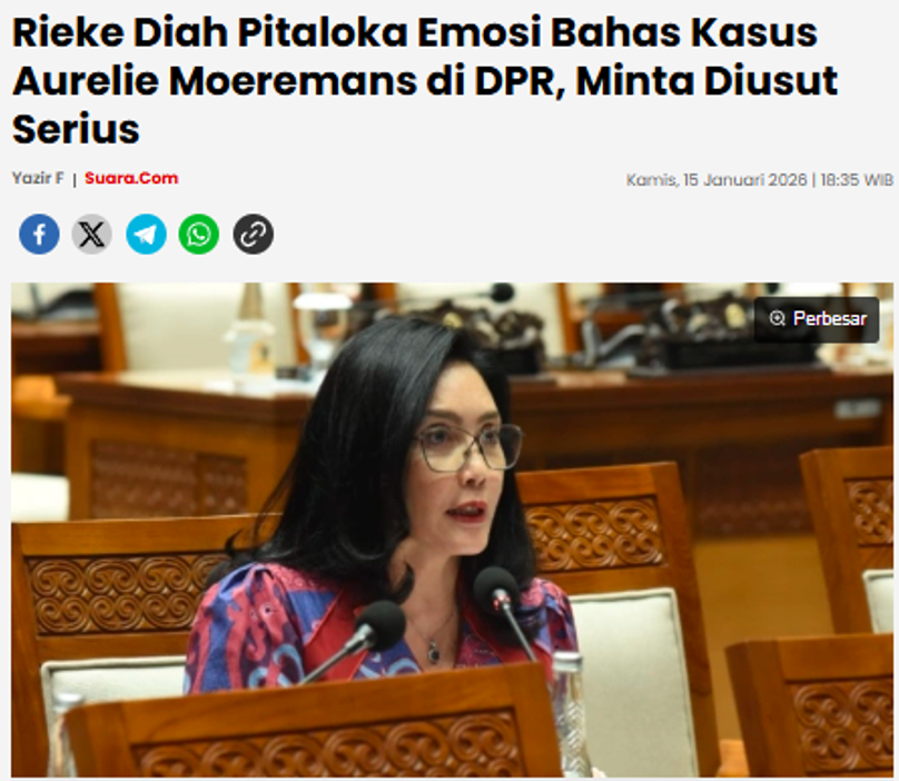 Member of the Indonesian House of Representatives (DPR) Commission XIII, Rieke Diah Pitaloka, highlighted the child grooming issue revealed by Aurelie Moeremans during a Commission XIII meeting with Komnas HAM and Komnas Perempuan on 15 January 2026. Rieke argued that social media plays an important role as a channel for justice struggles through what she called “Viral for Justice,” while referencing the free “Broken Strings” e-book that contains Aurelie’s traumatic experience due to grooming.