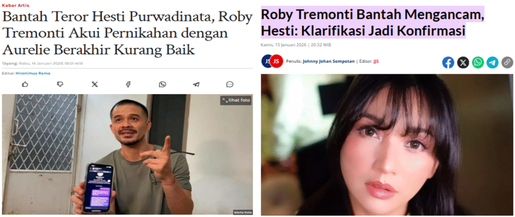 Roby Tremonti publicly admitted he did contact Hesti’s husband, but denied making threats. He argued the communication was polite because he felt hurt at being cornered one-sidedly. Although denied, this polemic grew and became part of the media peak on 14 January 2026, when Hesti responded that Roby’s clarification increasingly confirmed the truth of the pressure.