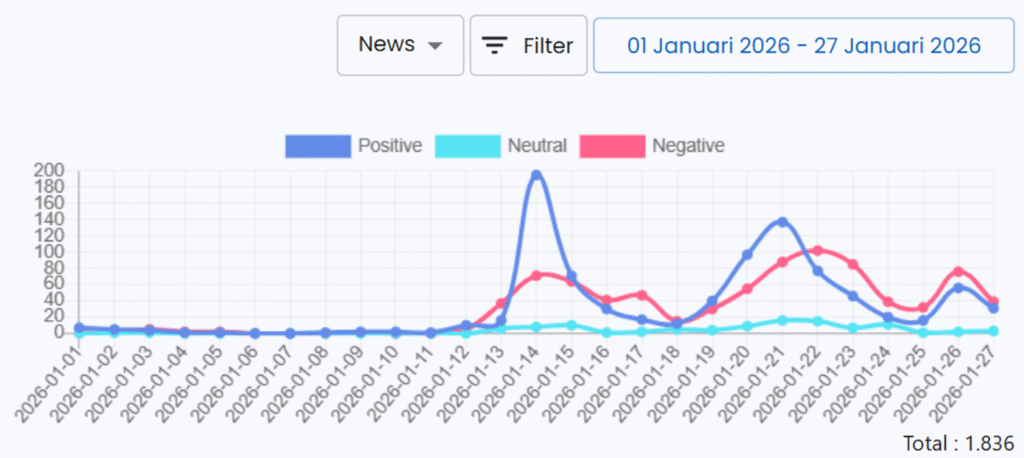 Newstensity recorded 1,836 mass-media articles discussing “Appointment of SPPG as PPPK” during January 1–27, 2026. Coverage peaked on January 14, 2026, coinciding with the national spread of reports on the National Nutrition Agency’s (BGN) announcement regarding the plan to appoint 32,000 core SPPG employees as PPPK effective February 1, 2026. After the peak, volume remained relatively high, driven by political attention, parliamentary criticism, and public responses to the policy’s implications.