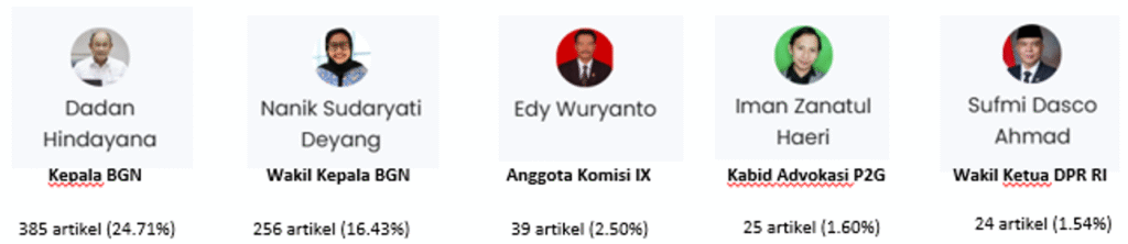 From the executive branch, BGN Head Dadan Hindayana was the most prominent, appearing in 385 articles (about 24.71% of total exposure). He functioned as the central authority framing the policy as operational necessity for MBG continuity. His institutional position provided strong legitimacy to present the decision as an instrument for quality control and program accountability.