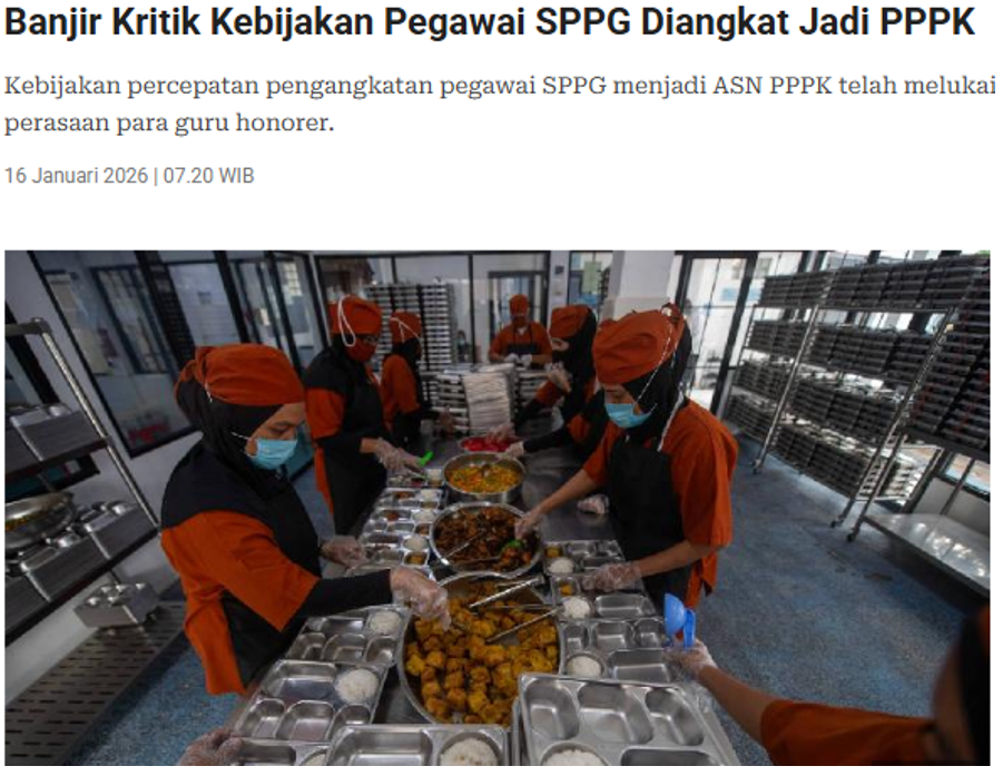 Media coverage and public responses to the plan to appoint SPPG employees as PPPK on February 1, 2026 show a broad spectrum of criticism—from parliament, professional organizations, to civil society. The objections do not come from a single group; they reflect cross-sector unease about the direction of national staffing policy: