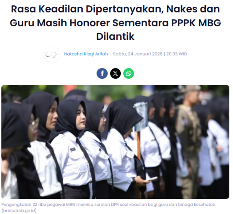 Criticism arises when the appointment of SPPG personnel as PPPK is implemented collectively without a national selection mechanism comparable to other sectors. Gerry Katon Mahendra, a Public Administration lecturer at Universitas ‘Aisyiyah Yogyakarta, argued that the plan may blur merit-system principles and harm fairness if not preceded by rigorous assessment that also considers cross-sector urgency—such as the status uncertainty faced by honorary teachers. Without clear and professional regulation, such a policy could reduce the credibility of civil service recruitment and weaken public trust in bureaucratic quality.