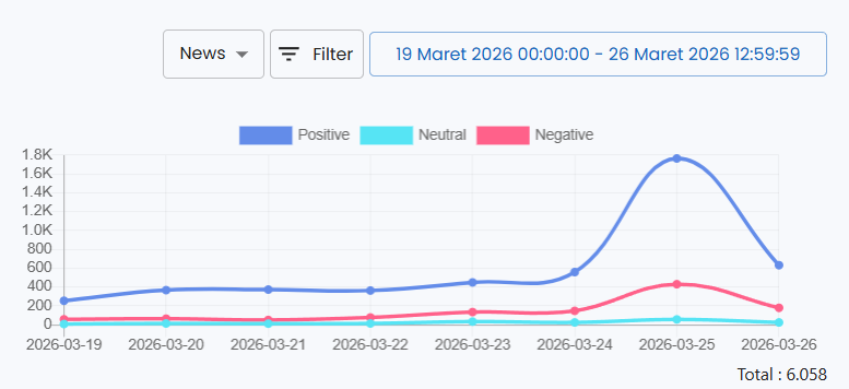 Based on media monitoring captured through PT Nestara Teknologi Teradata’s Newstensity tools, mass media coverage of this issue was quite high during the period from March 19 to March 26, 2026, reaching a total of 6,058 articles. Coverage was dominated by positive sentiment at 78%, followed by negative sentiment at 19%. Neutral sentiment accounted for the smallest share at 3%. The coverage peaked on March 25, 2026.