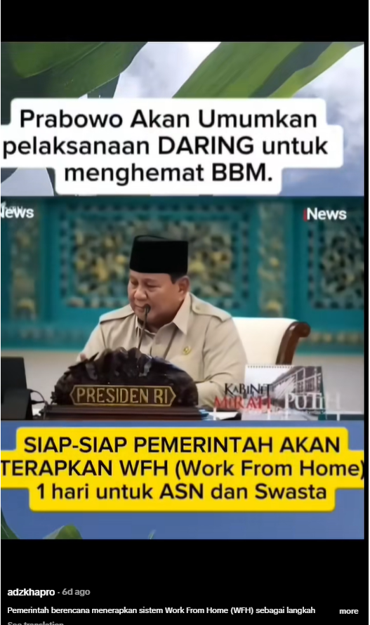 A TikTok upload by the account @Adzkhapro (65,623 followers), featuring a clip of President Prabowo Subianto announcing the one-day WFH policy, became the content that drew the most public attention. It recorded 4,434,892 views, 65,840 likes, 16,328 comments, and 43,080 shares.