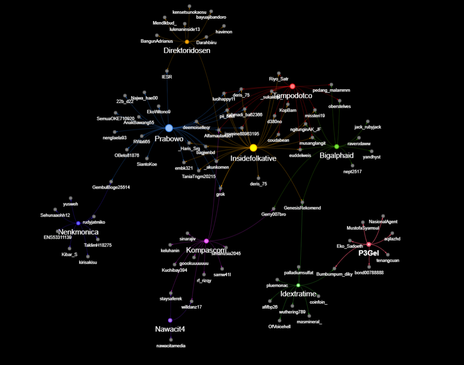 Referring to the social network analysis in the Socindex social media monitoring tool, several accounts became central points of attention when netizens discussed this issue. These included the President of Indonesia (Prabowo Subianto), advocacy-related accounts (Direktoridosen), media accounts (Kompas.com and Tempo.com), accounts such as insidefolkative, bigalphaid, and idxtratime, as well as news aggregator accounts such as P3Gel. These accounts uploaded content about the one-day WFH policy for civil servants and received significant interaction from netizens.