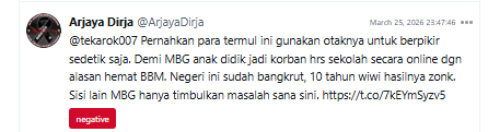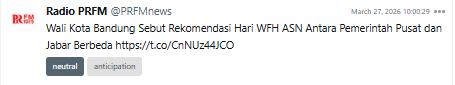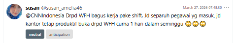 The one-day WFH policy also intersects with other government policies, such as MBG (Free Nutritious Meals), which many netizens view as controversial. As a result, uncertainty around the WFH policy has in some cases shifted into negative sentiment, especially because many netizens doubt the Indonesian government’s ability to genuinely enforce the policy.