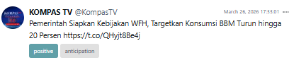 Meanwhile, Purbaya Yudhi Sadewa (Minister of Finance, as stated in the document) emphasized the potential fuel savings from implementing WFH. The narrative built around him focused on estimated energy efficiency, reinforcing the framing that this policy is a tactical step to suppress energy demand.