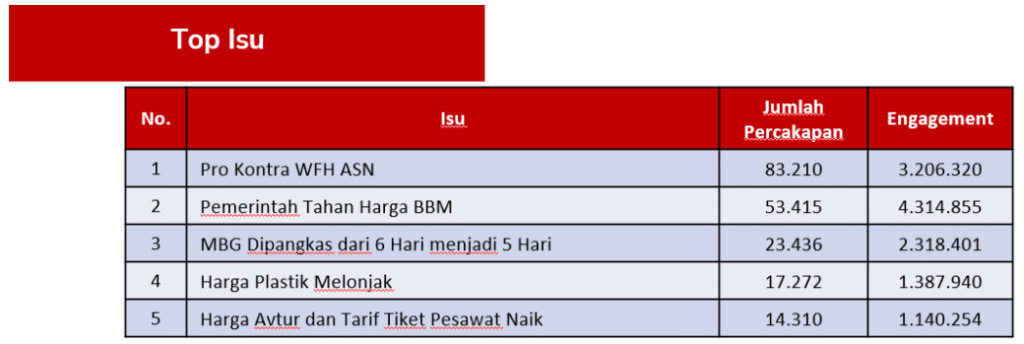 The government needs to focus its communication on the issues currently generating the highest conversation volume, namely WFH for civil servants, fuel availability and prices (subsidized and non-subsidized), the MBG program, and rising prices such as plastic prices and aviation fuel prices that have led to higher airline ticket fares.