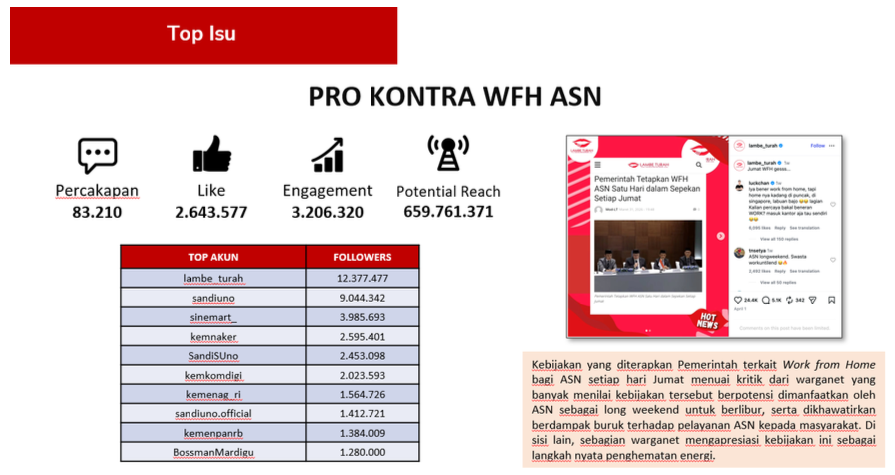 In another section, Danu explained that during the monitoring period, the two most dominant issues discussed by netizens were the Friday WFH policy for civil servants and the optimization of the Free Nutritious Meals (MBG) program.