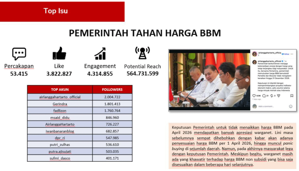 That concern, Danu continued, had briefly triggered panic buying behavior in several regions. However, after the government officially announced that fuel prices would not be raised in April 2026, the public felt relieved. “The decision to keep fuel prices unchanged became one of the points most appreciated by netizens, although a small portion still voiced concerns about possible adjustments to non-subsidized fuel prices in the future,” Danu added.